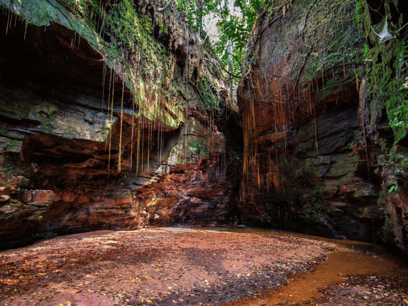 Quase secreto, o Cânion Sussuapara é um dos lugares mais mágicos do Jalapão. Um corredor estreito entre duas paredes rochosas que escorrem água continuamente, formando pequenas quedas e criando um microclima fresco e úmido. A vegetação toma conta do espaço, com raízes pendendo como cortinas vivas.