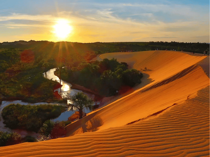 Nada prepara para o visual das dunas surgindo no meio do cerrado. Tons dourados que mudam conforme o sol se move no céu e uma vista que se estende até o horizonte. No final da tarde, o pôr do sol transforma o lugar em um cenário cinematográfico. Cada grão de areia parece brilhar.